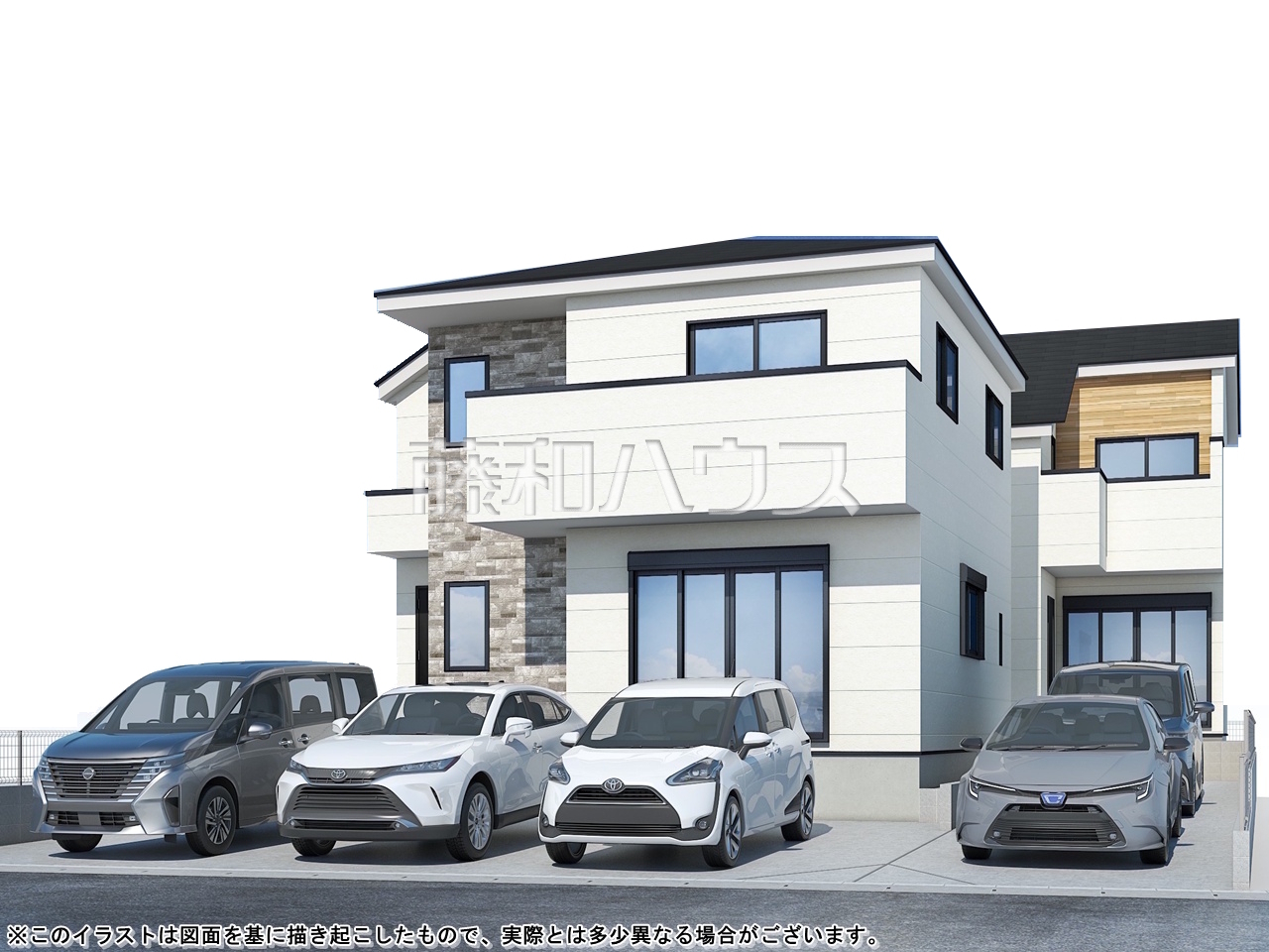 - 完成予想図については、外構、植栽、外観等実際のものとは多少異なることがあります。