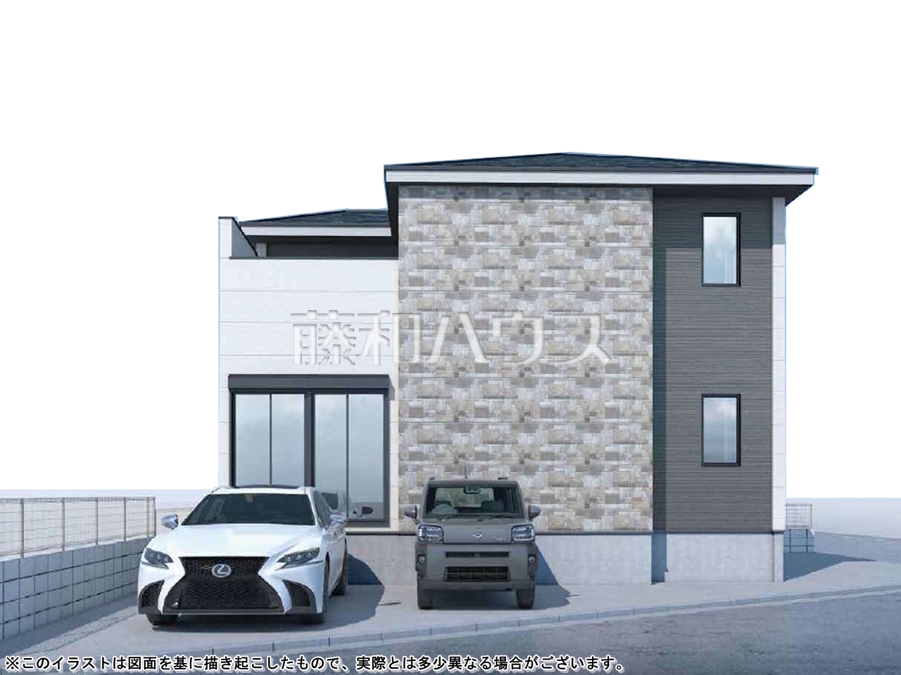 - 完成予想図については、外構、植栽、外観等実際のものとは多少異なることがあります。