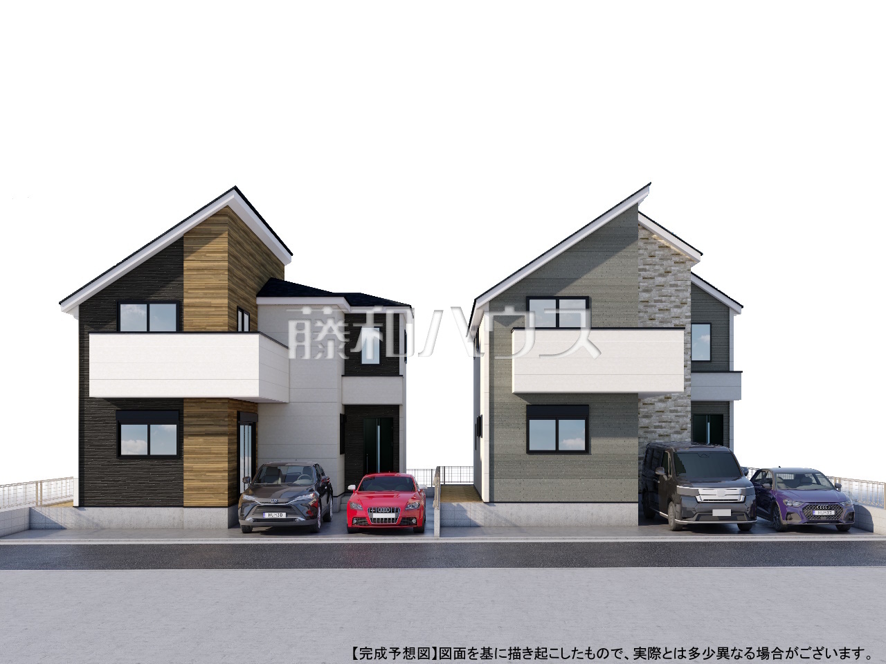 - 完成予想図については、外構、植栽、外観等実際のものとは多少異なることがあります。