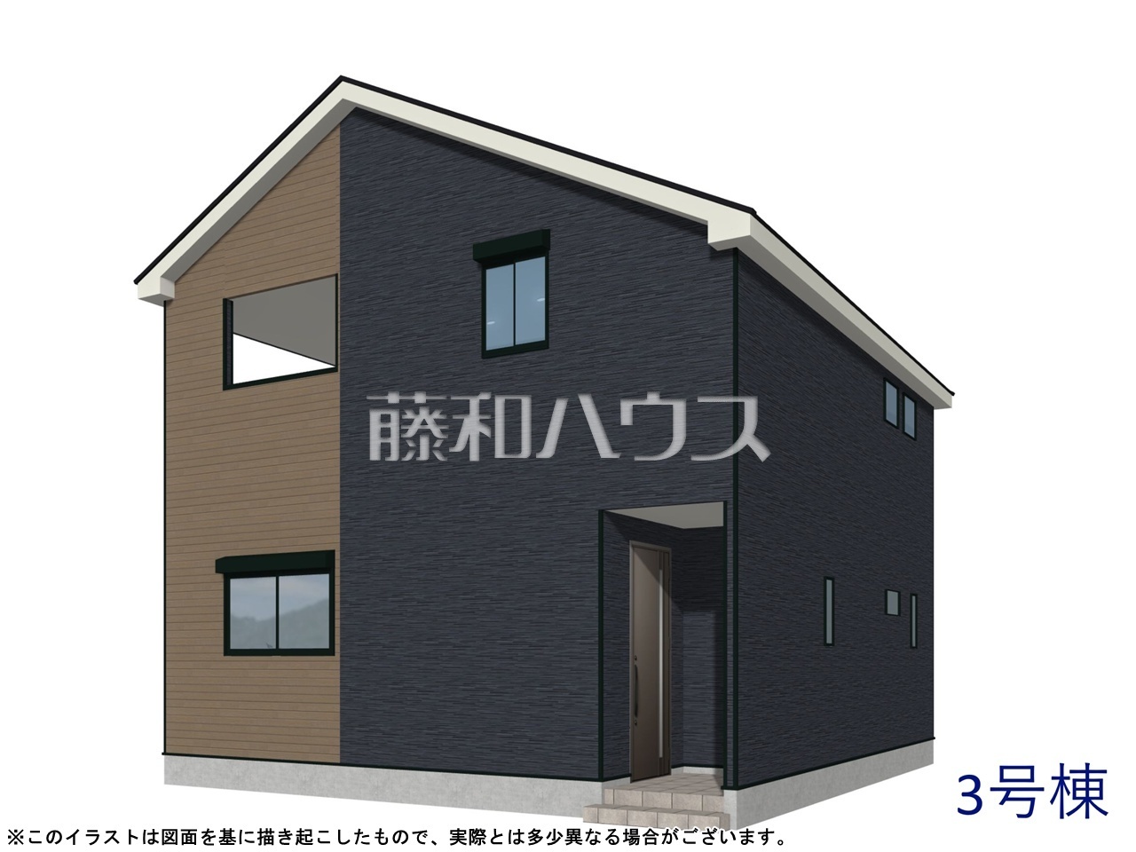 3号棟 完成予想図(外観) 東南角地に位置する3号棟は特別な解放感のある区画になります。お探しの物件に出会うためには、早めのご確認をオススメします。未完成...