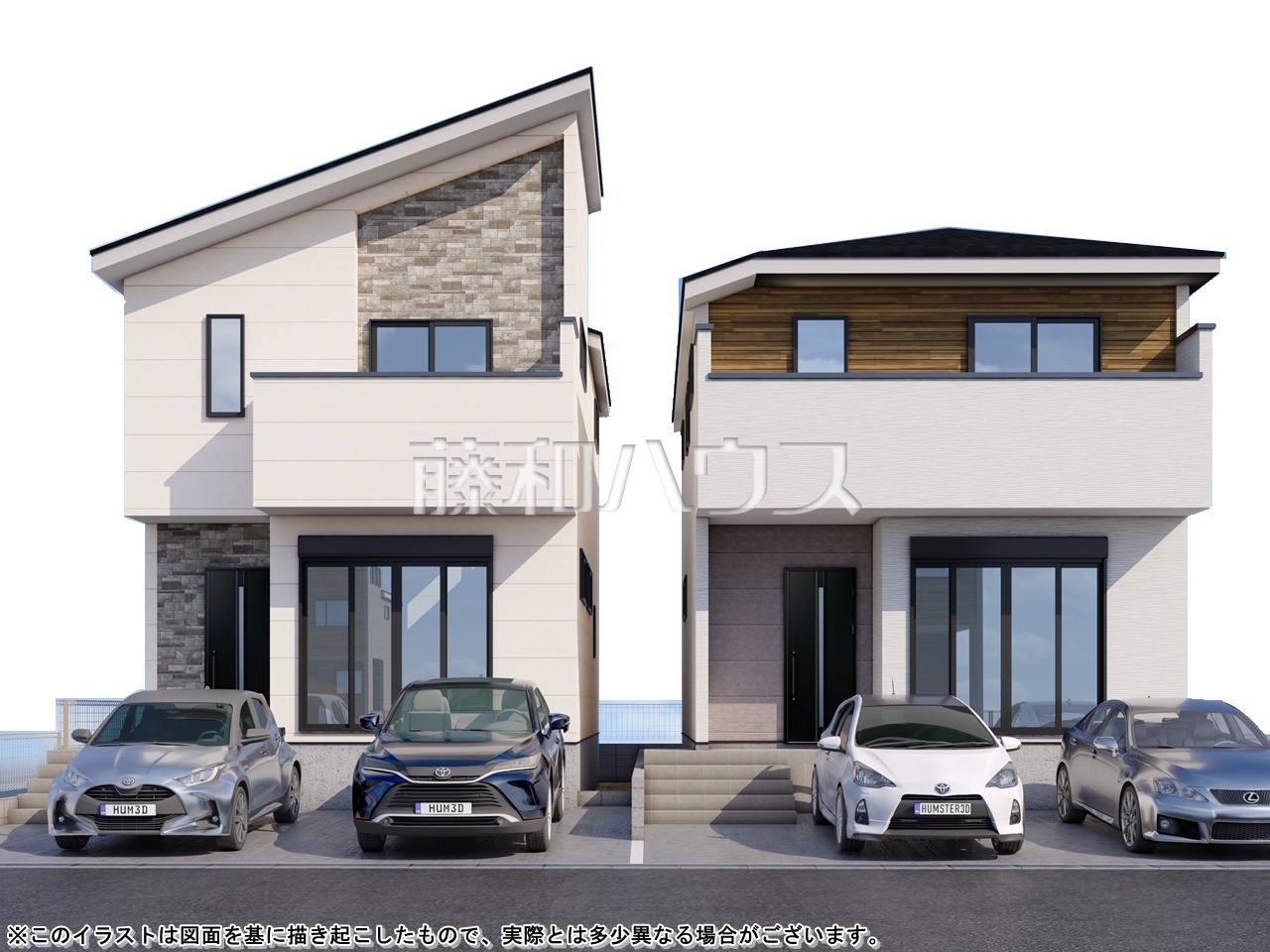 - 完成予想図については、外構、植栽、外観等実際のものとは多少異なることがあります。