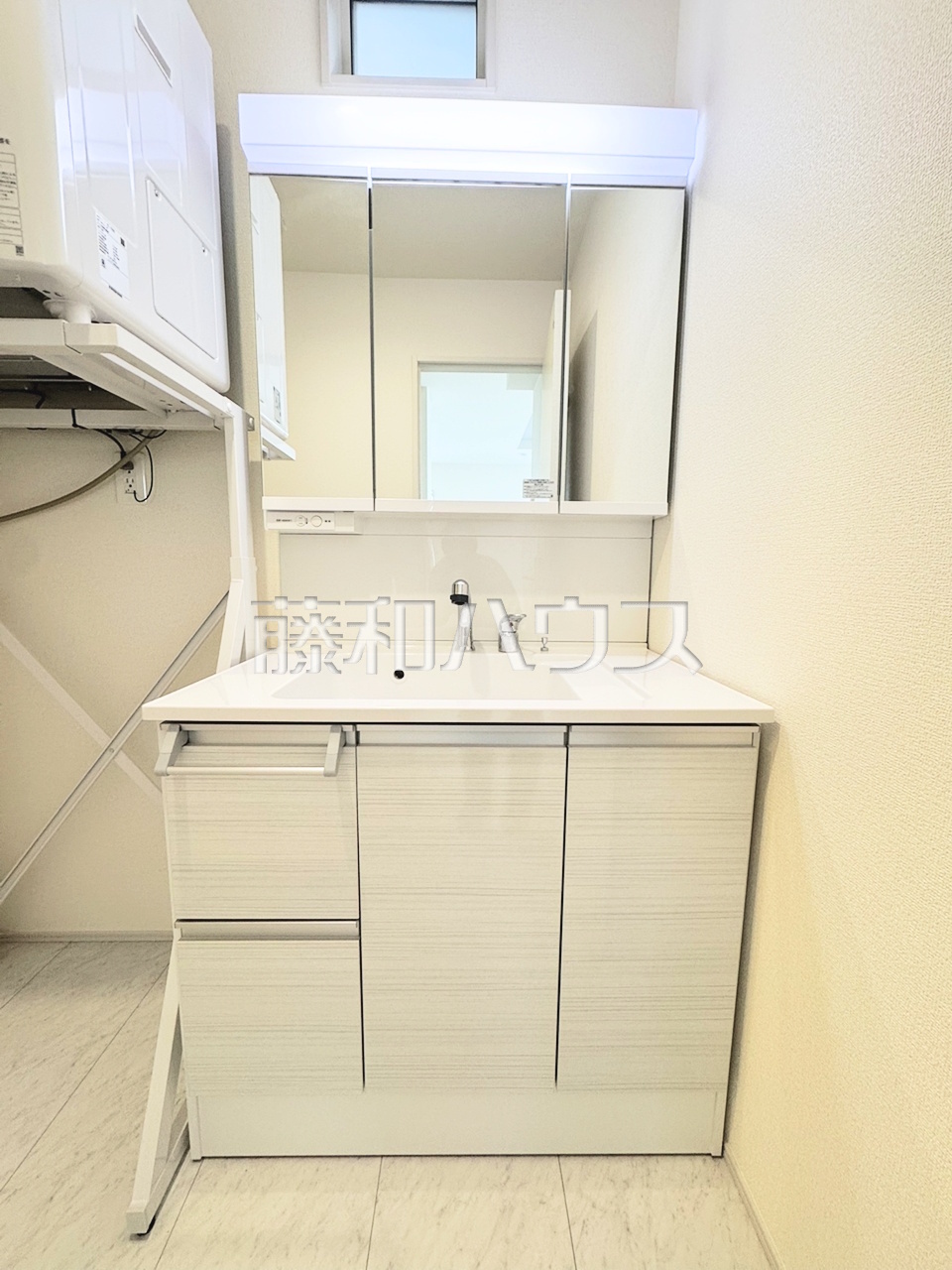 1号棟 洗面室 【沖縄市美里仲原町】 三面鏡付きの洗面台。鏡の裏にも収納があり、歯ブラシや化粧品等もすっきり収納できます。