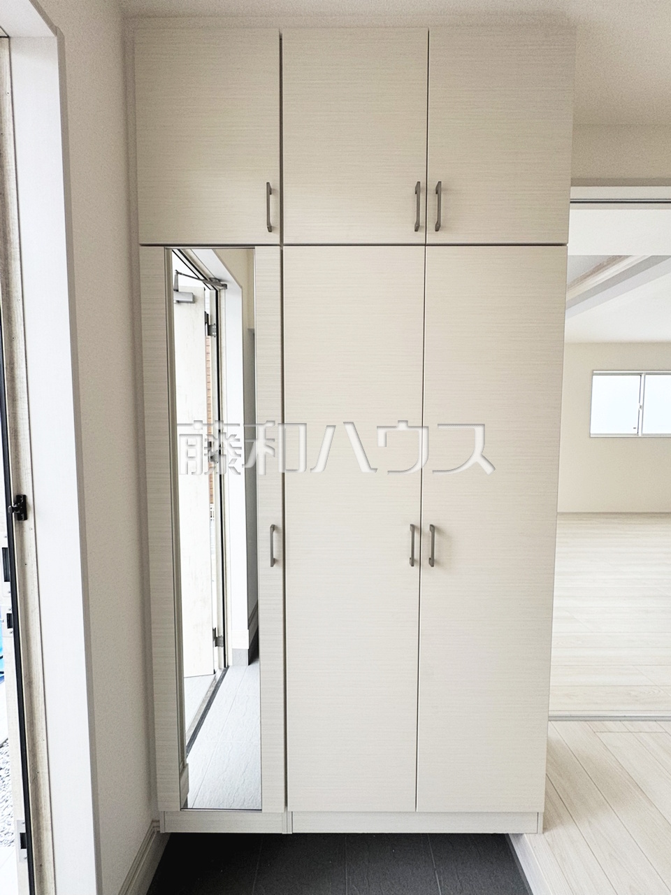 1号棟 玄関 【沖縄市美里仲原町】 玄関収納にはゴルフバッグやキャリーケース、お子様の遊び道具などを収納し、来客のある玄関を綺麗に片付けておけます。
