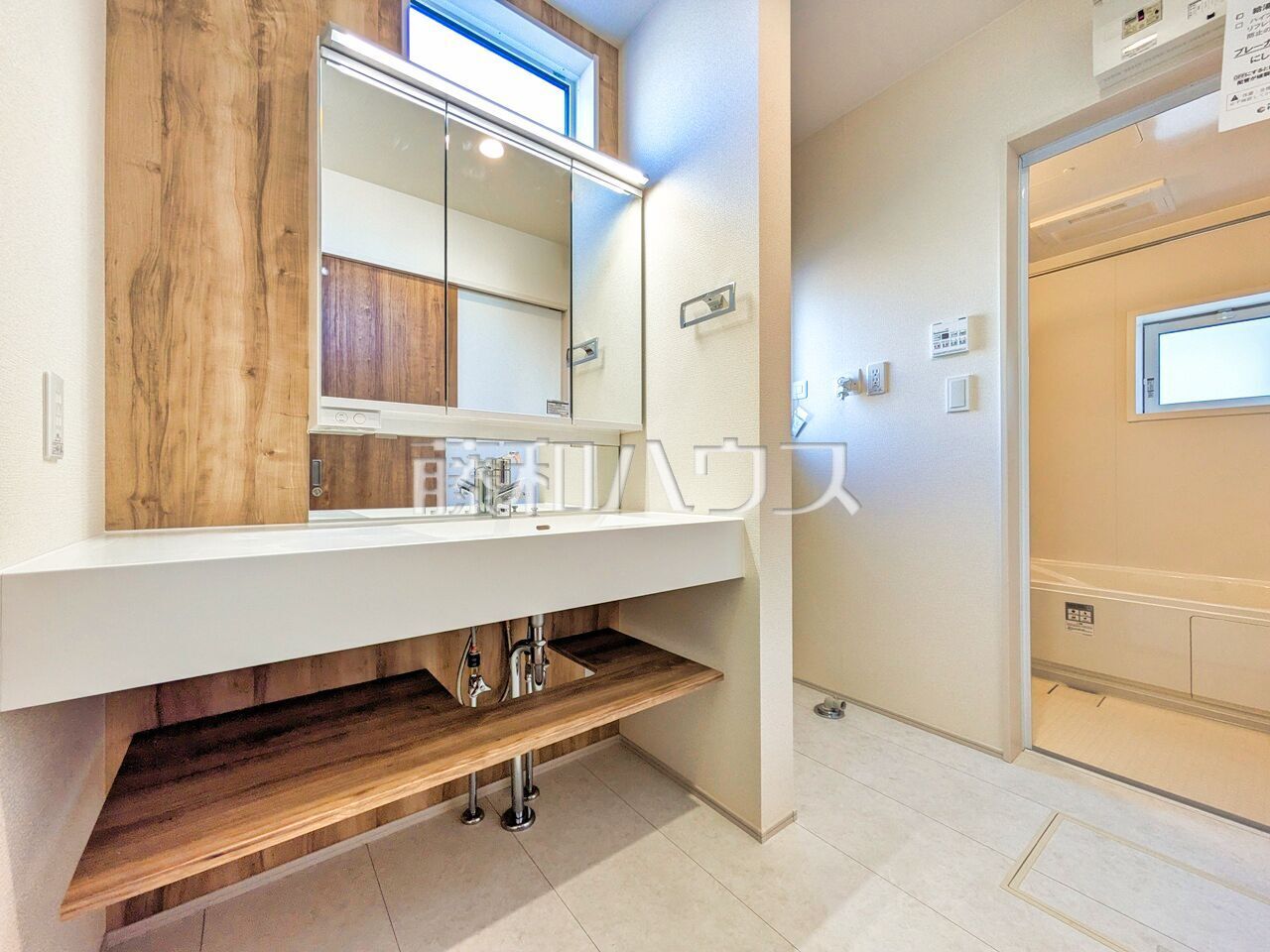 三面鏡付きの洗面台。鏡の裏にも収納があり、歯ブラシや化粧品等もすっきり収納できます。 【志木市下宗岡4丁目】