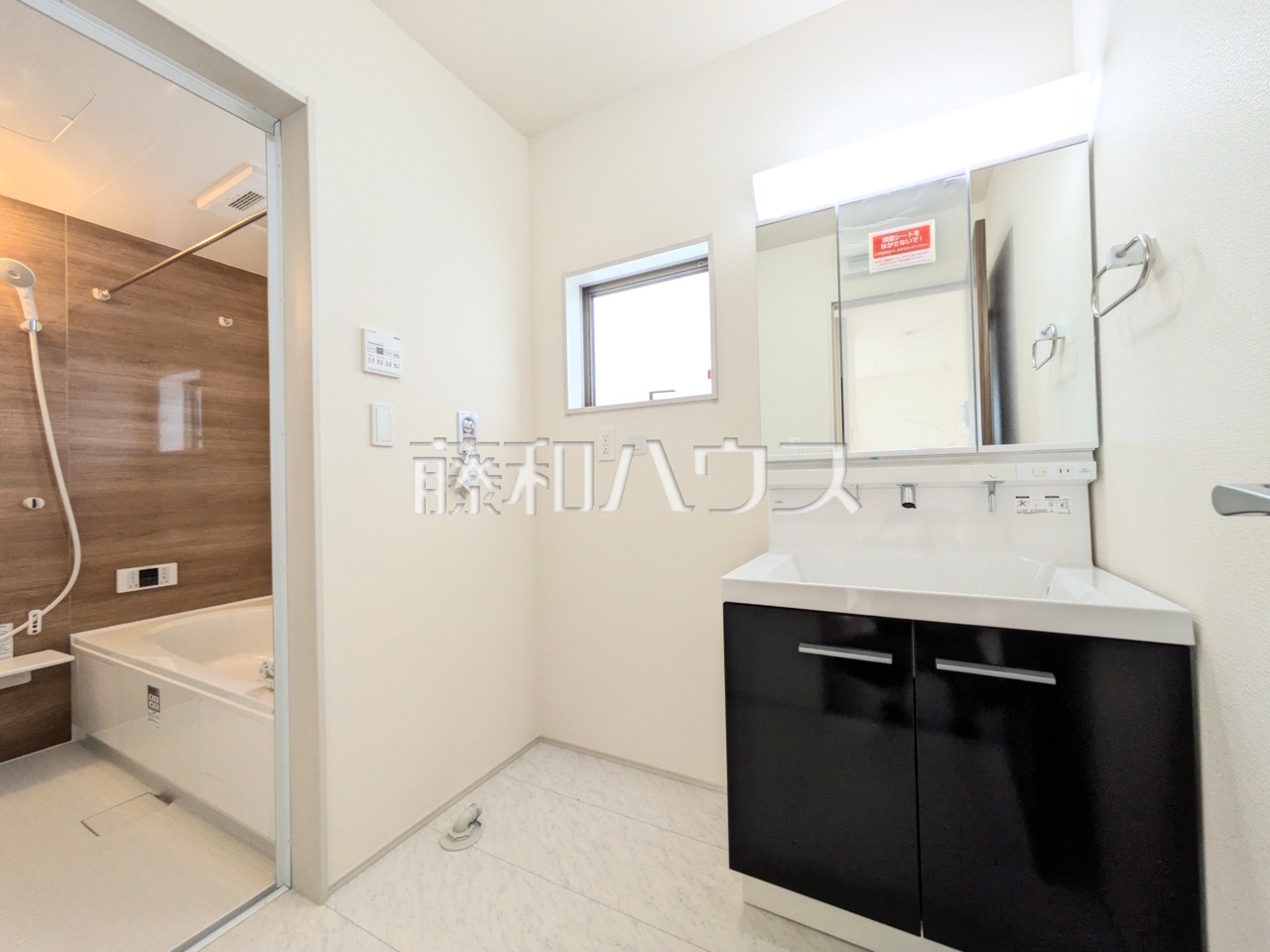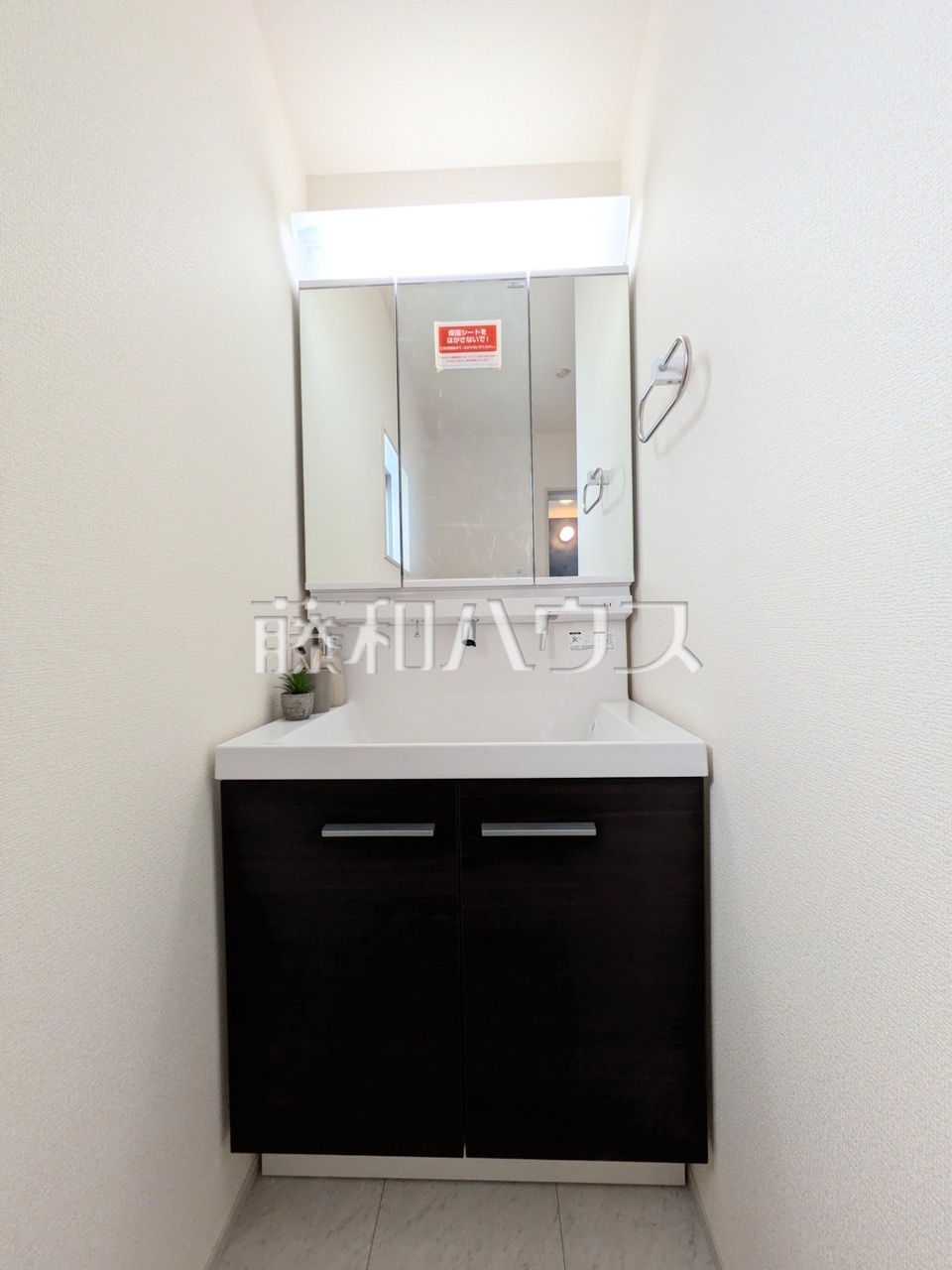 1号棟 洗面室 【豊見城市字我那覇】 三面鏡付きの洗面台。鏡の裏にも収納があり、歯ブラシや化粧品等もすっきり収納できます。