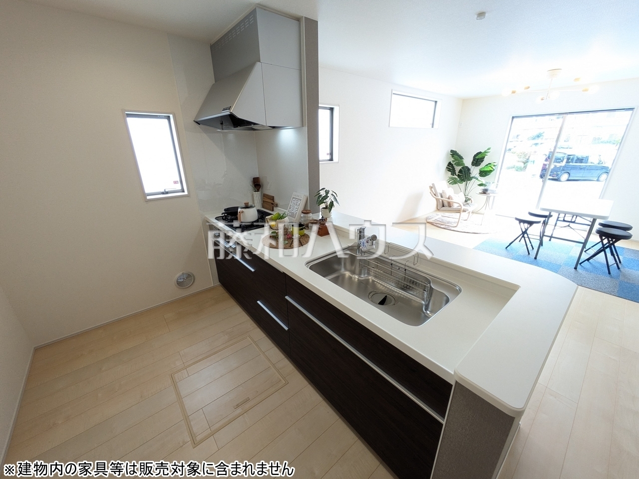 1号棟 キッチンからのリビング 【豊見城市字我那覇】 ご家族の様子がわかり、会話も楽しめる対面式システムキッチン