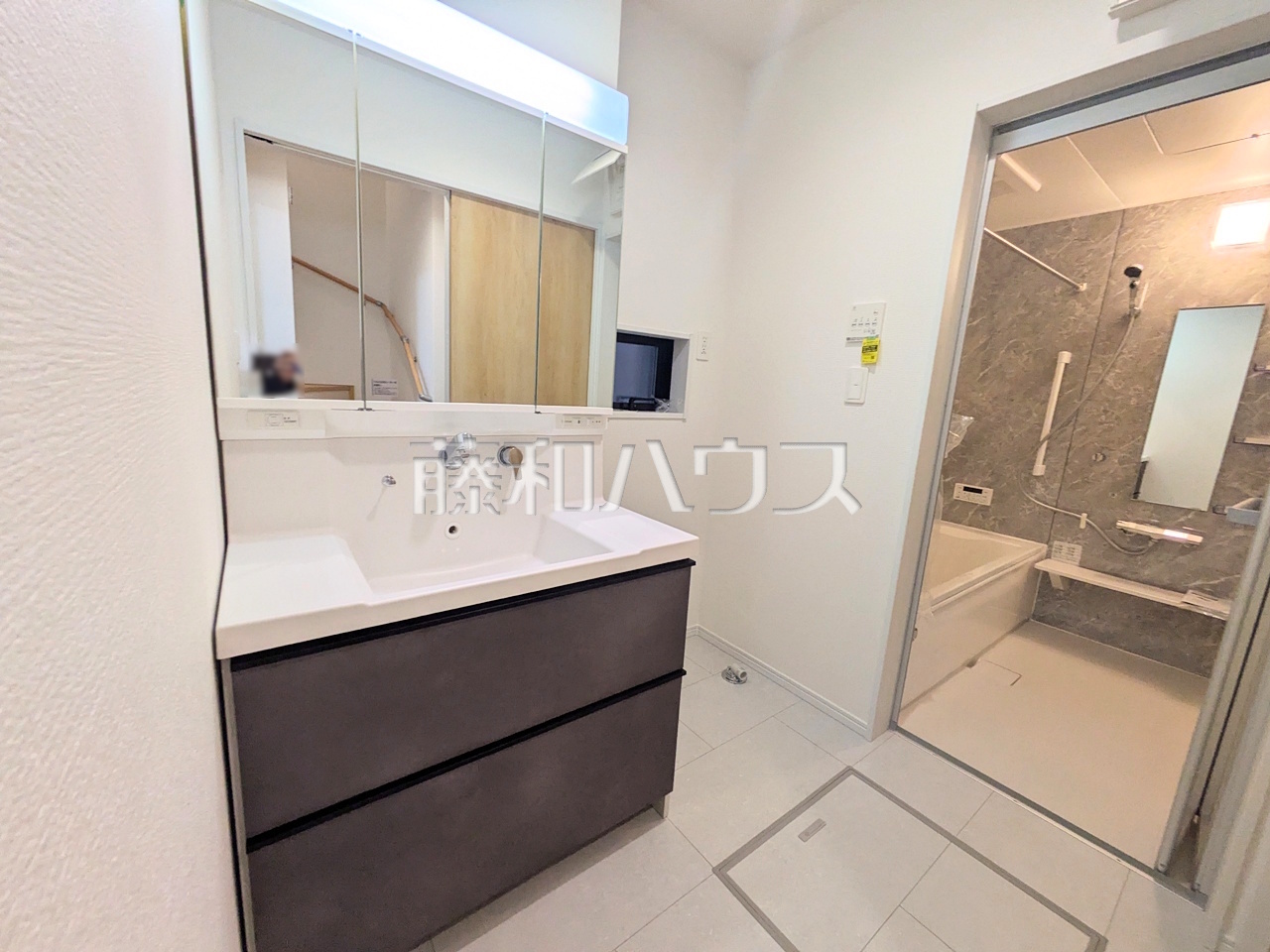 1号棟 三面鏡付きの洗面台。鏡の裏にも収納があり、歯ブラシや化粧品等もすっきり収納できます。 【和光市諏訪】
