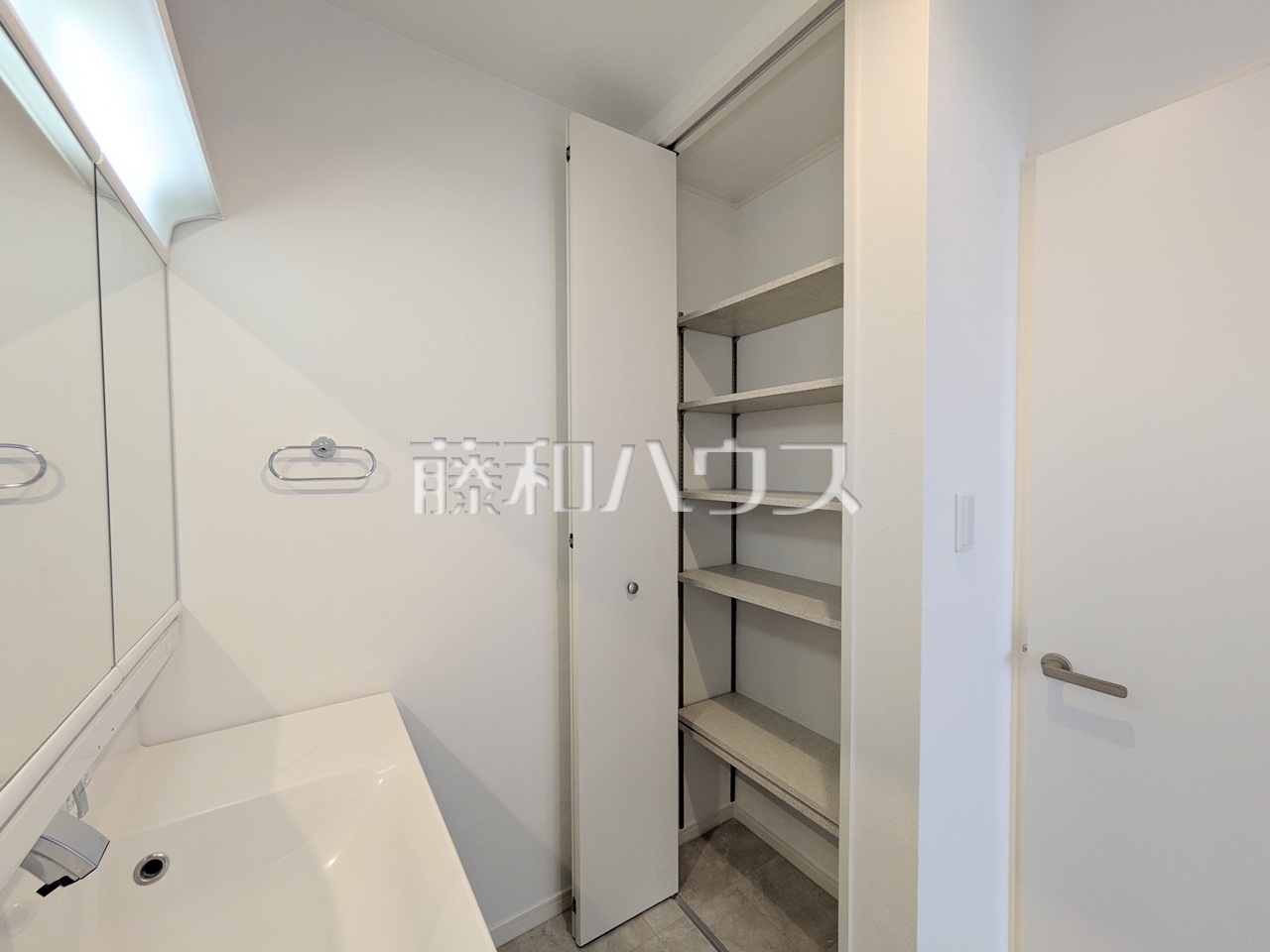 収納 【日野市多摩平7丁目】洗面室にはバスタオルや洗面具などをきれいに整理できる便利な棚を設置しました。
