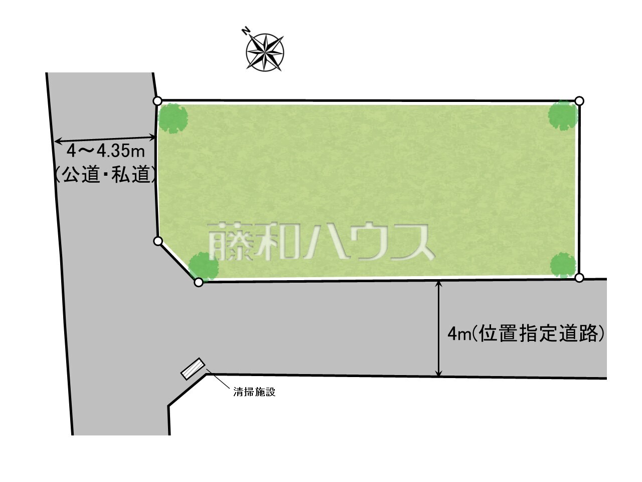 | 接道 | 接道状況:角地 北西4m公道 南西4m私道(位置指定あり) | ||