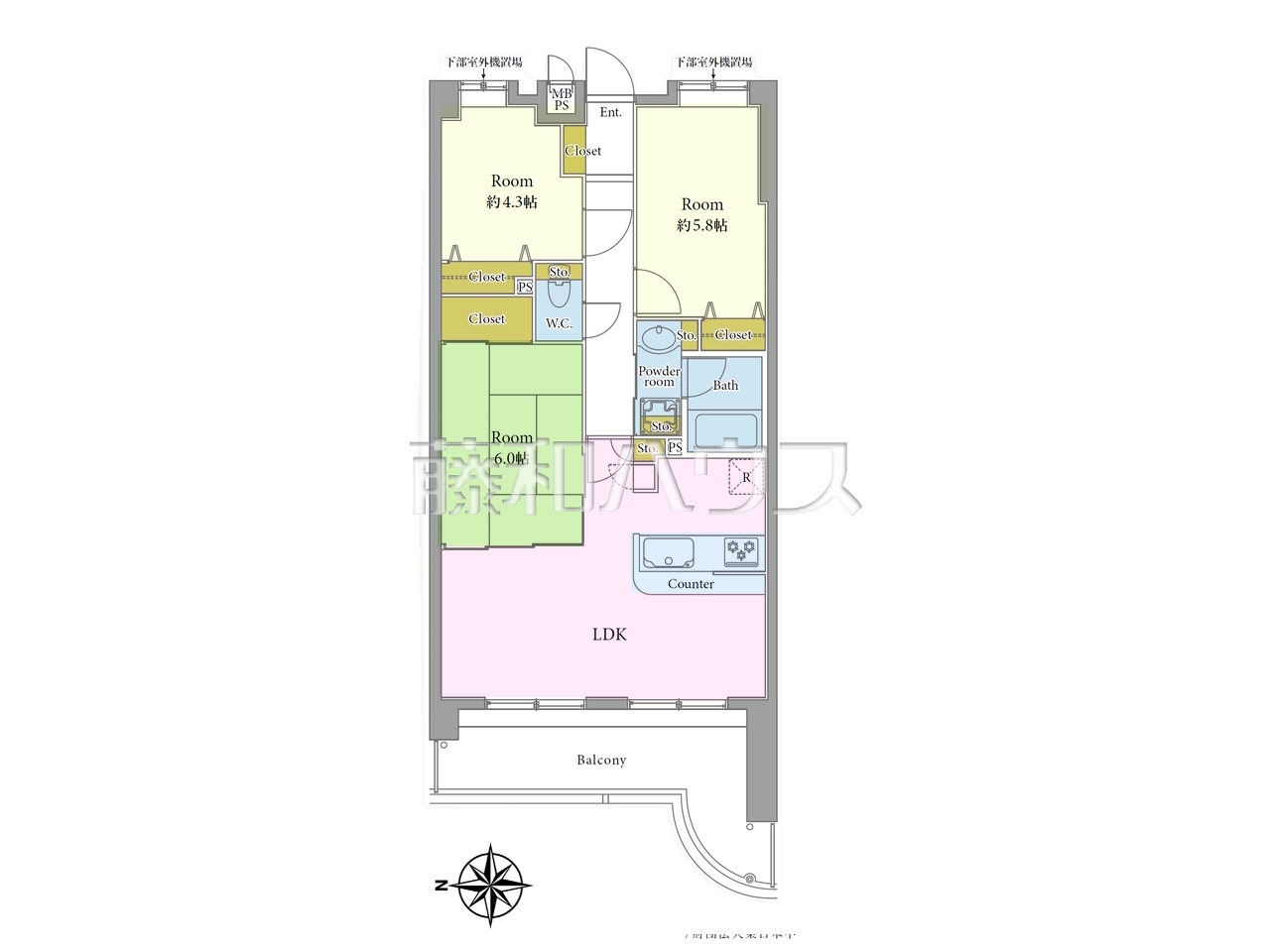 | 専有面積 | 64.27m²(壁芯) | バルコニー | 13.48m²(西向き) |
