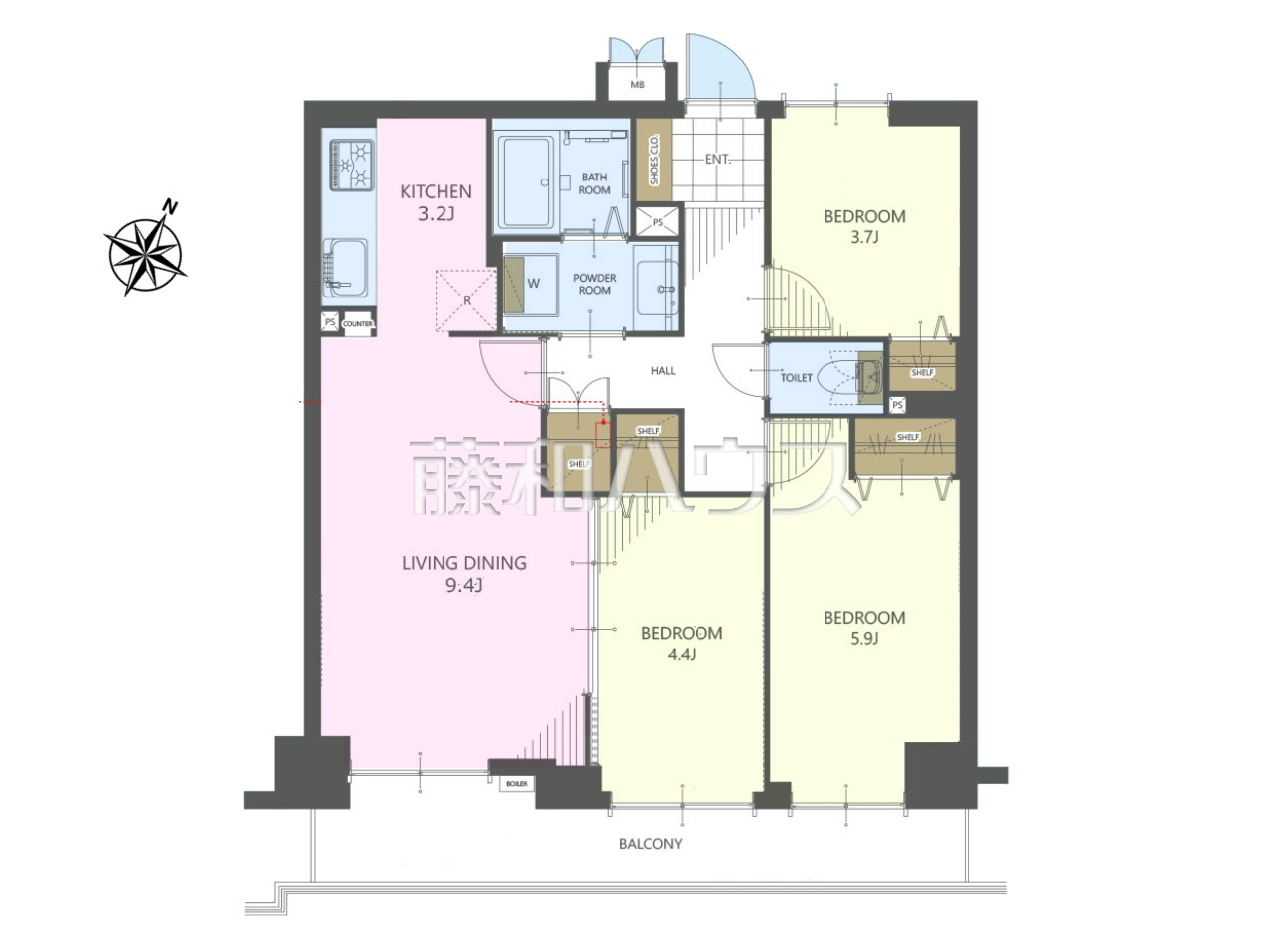 | 専有面積 | 61.58m²(壁芯) | バルコニー | 8.48m²(南東向き) |