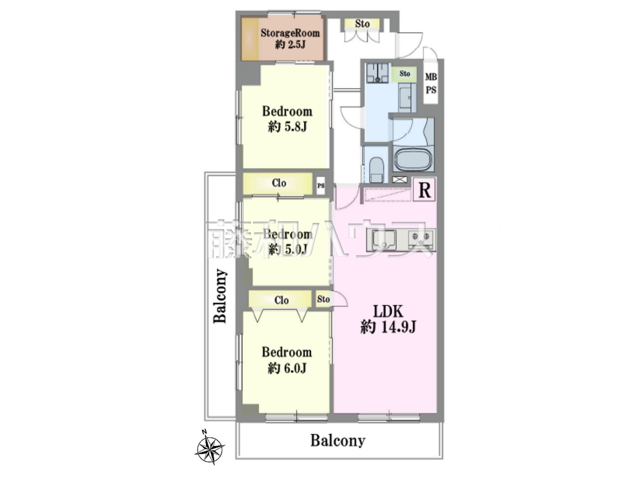 | 専有面積 | 75.35m²(壁芯) | バルコニー | 12.96m²(南西向き) |