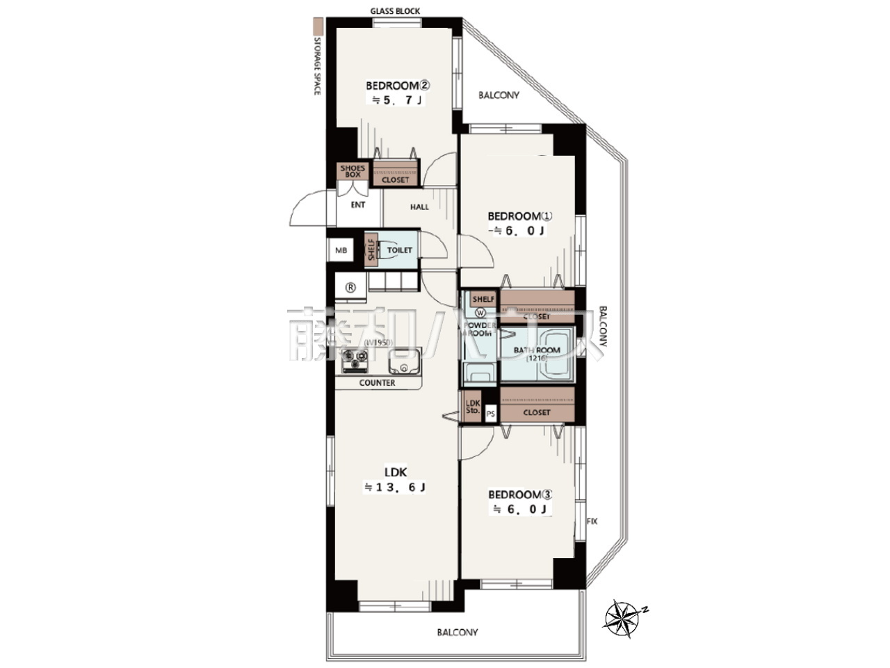 | 専有面積 | 66.6m²(壁芯) | バルコニー | 19.79m²(南東向き) |