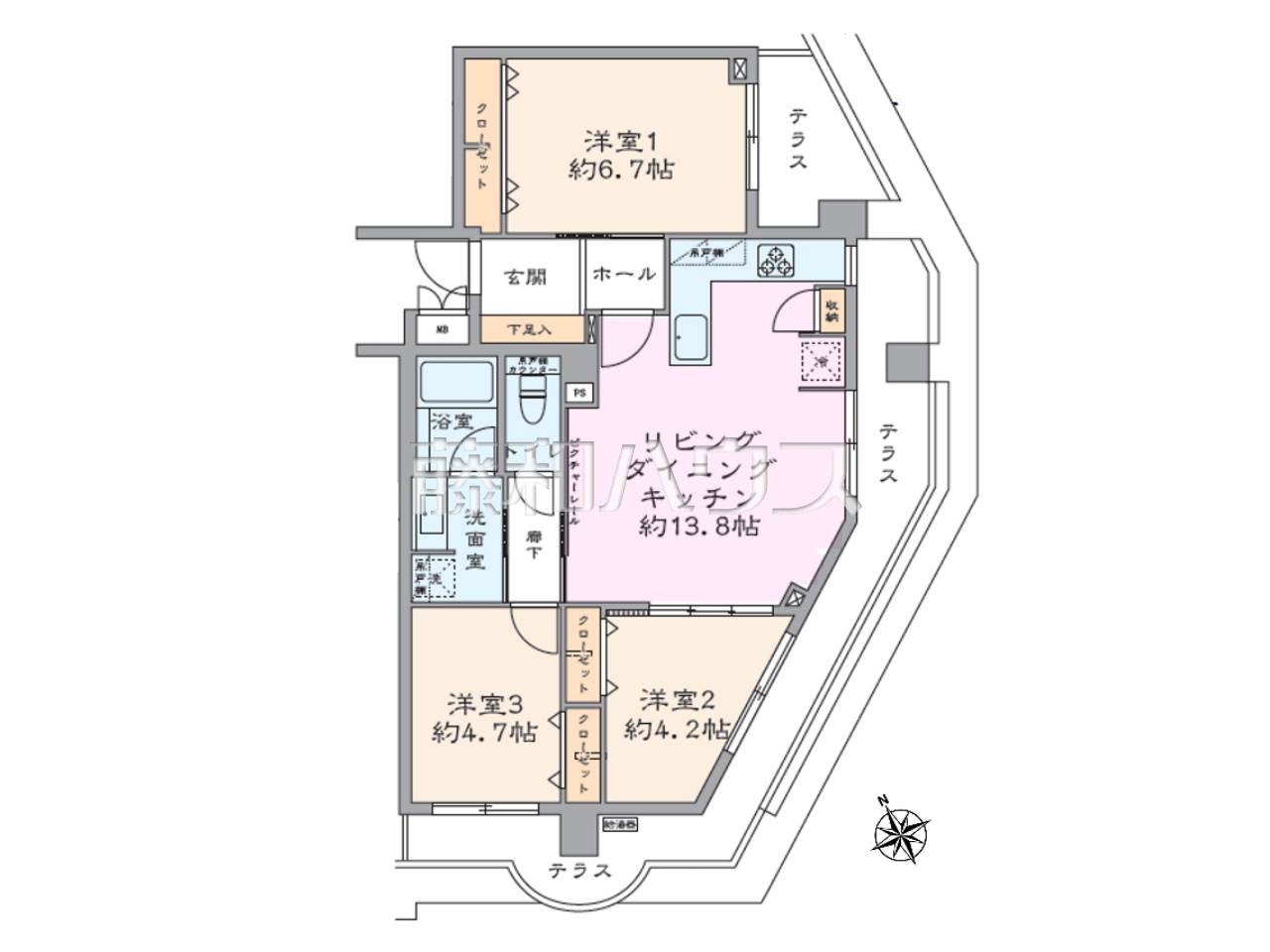 | 専有面積 | 67.51m²(壁芯) | バルコニー | 15.8m²(南向き) |