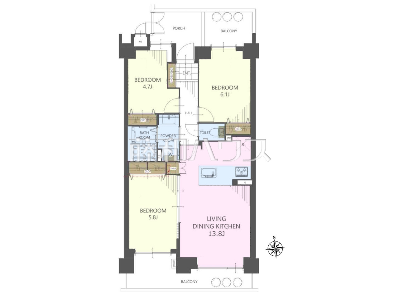 | 専有面積 | 66.37m²(壁芯) | バルコニー | 13.89m²(南向き) |