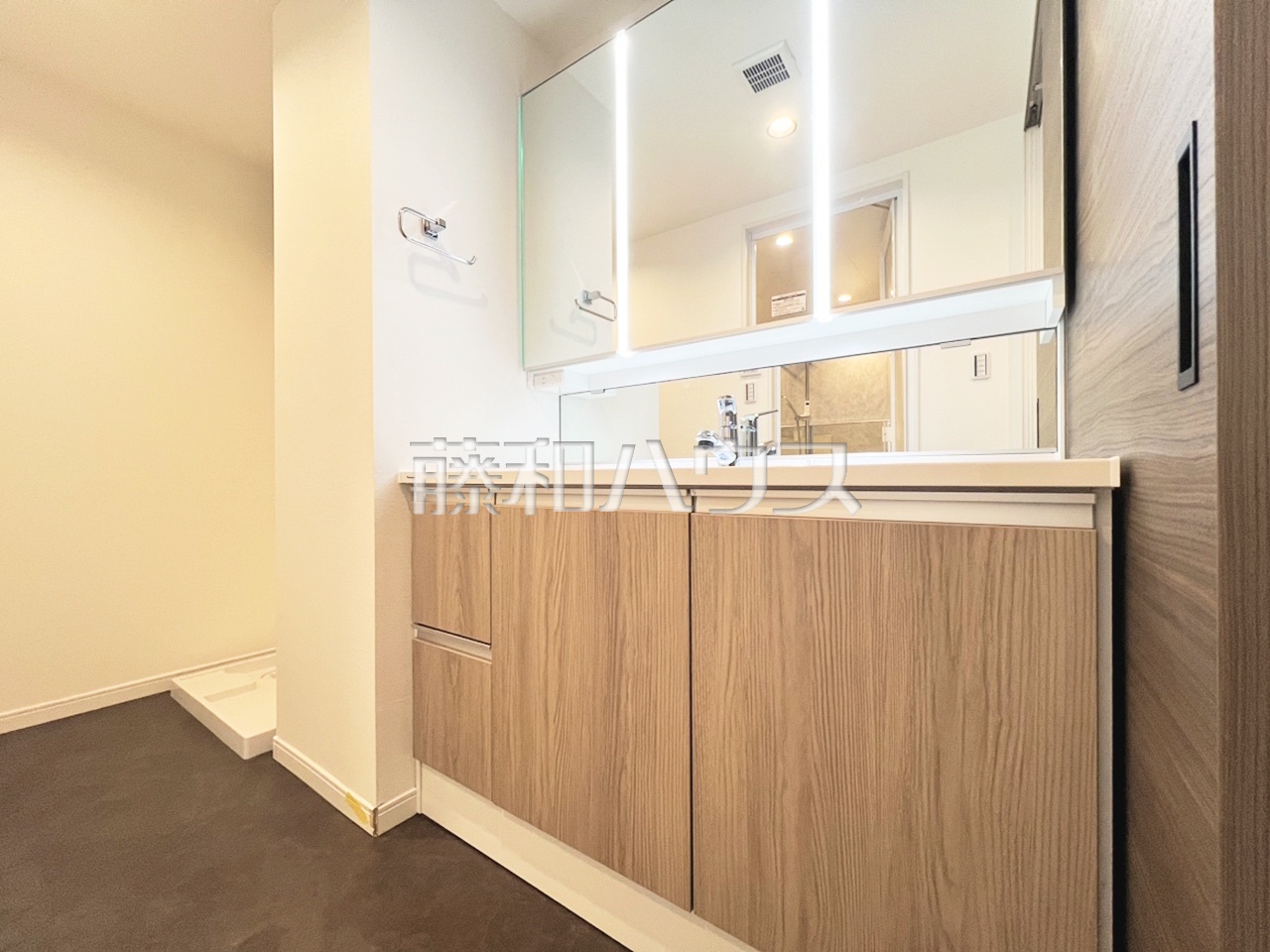 ≪洗面室≫三面鏡付きの洗面台。鏡の裏にも収納があり、歯ブラシや化粧品等もすっきり収納できます。【ジェイシティ千歳烏山】