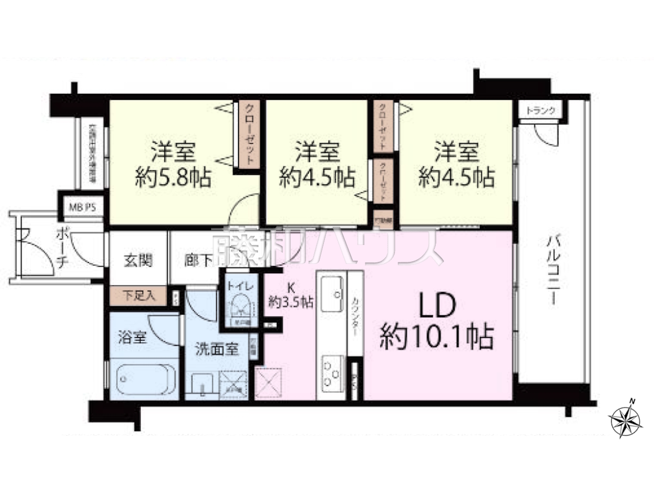 | 専有面積 | 63.68m²(壁芯) | バルコニー | 10.49m²(北東向き) |