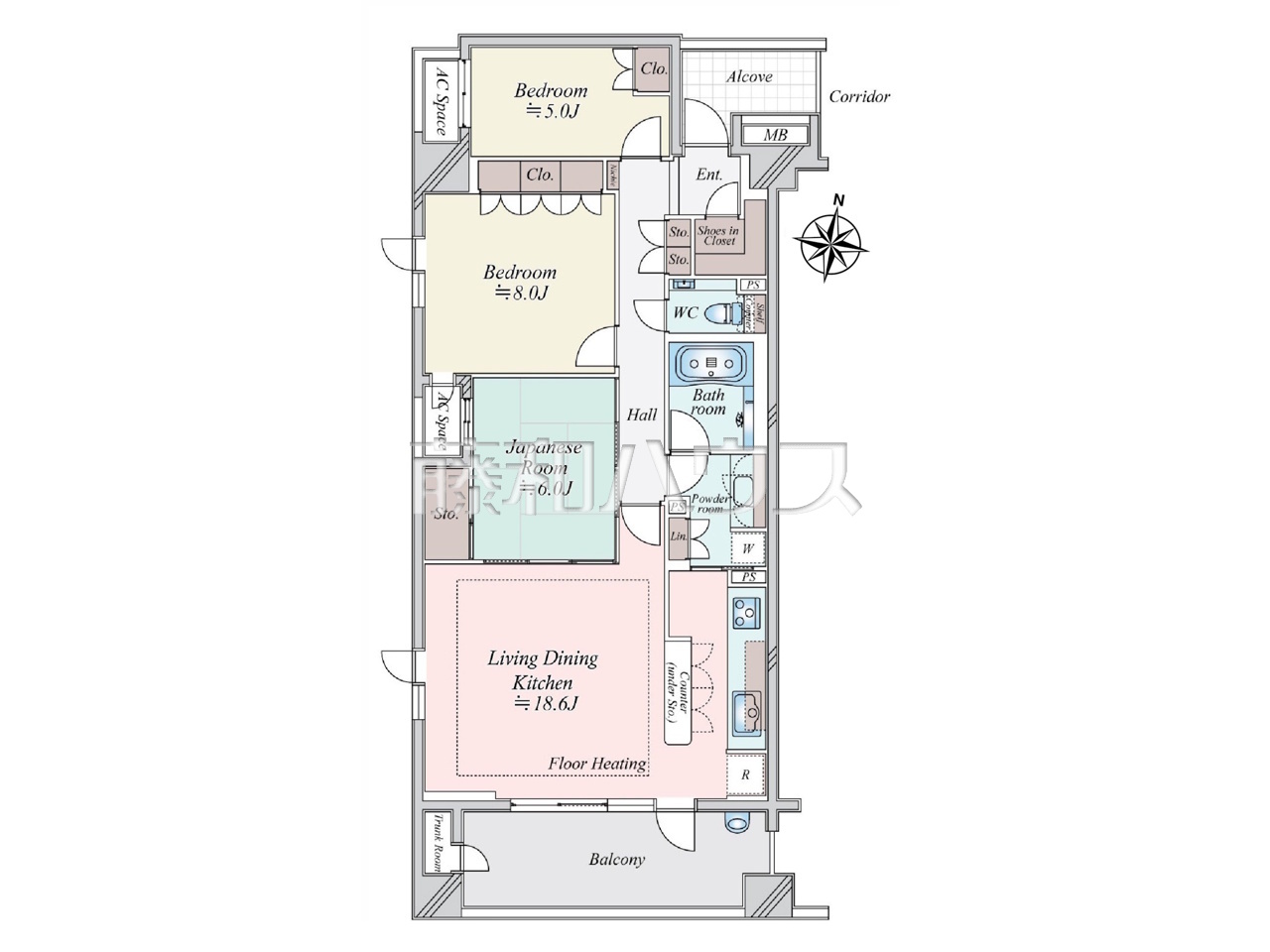 | 専有面積 | 90.14m²(壁芯) | バルコニー | 12.48m²(南向き) |