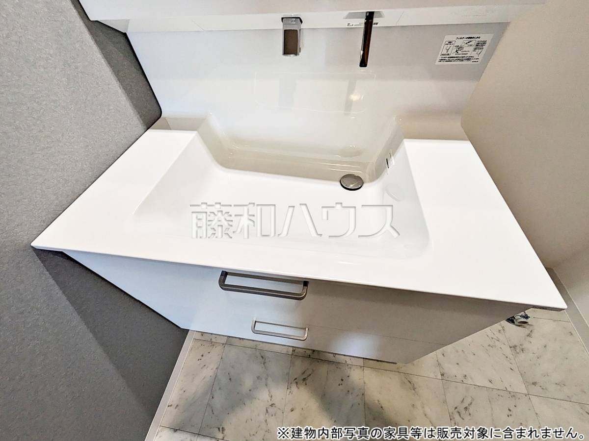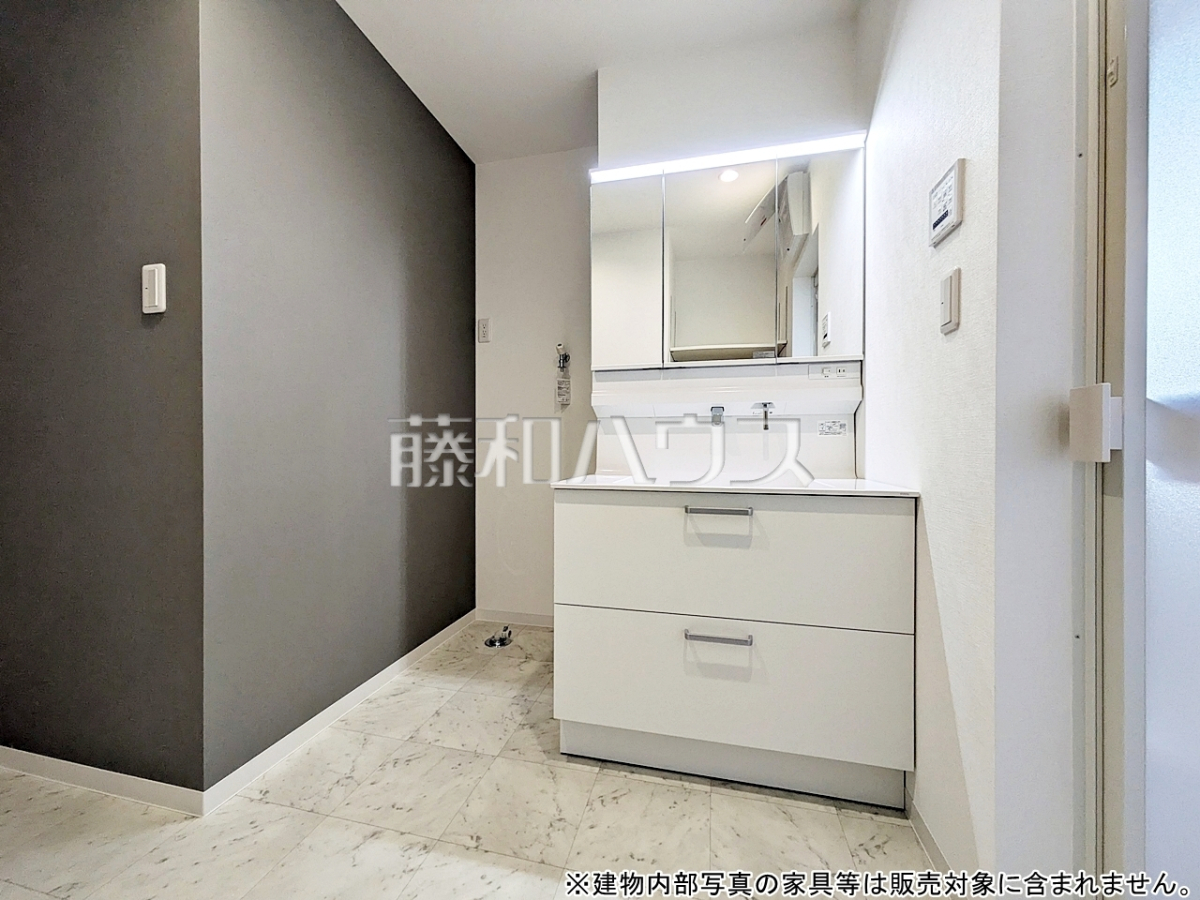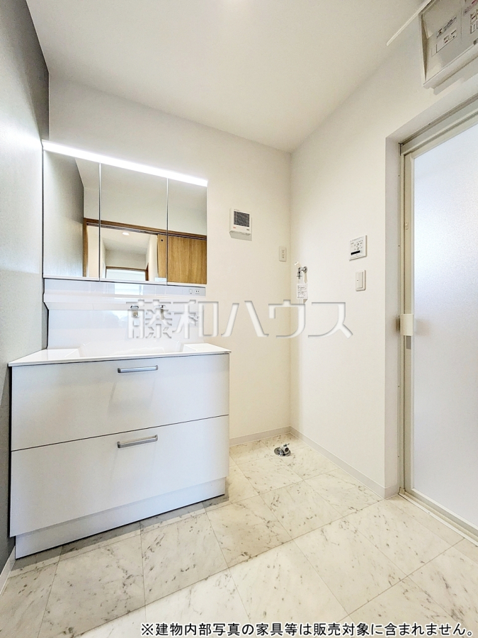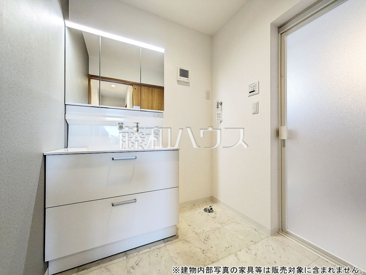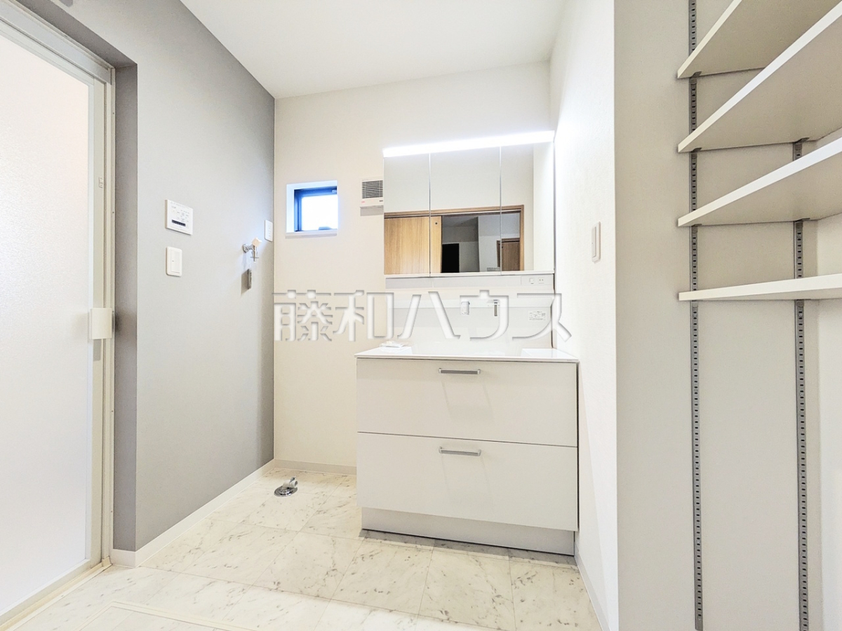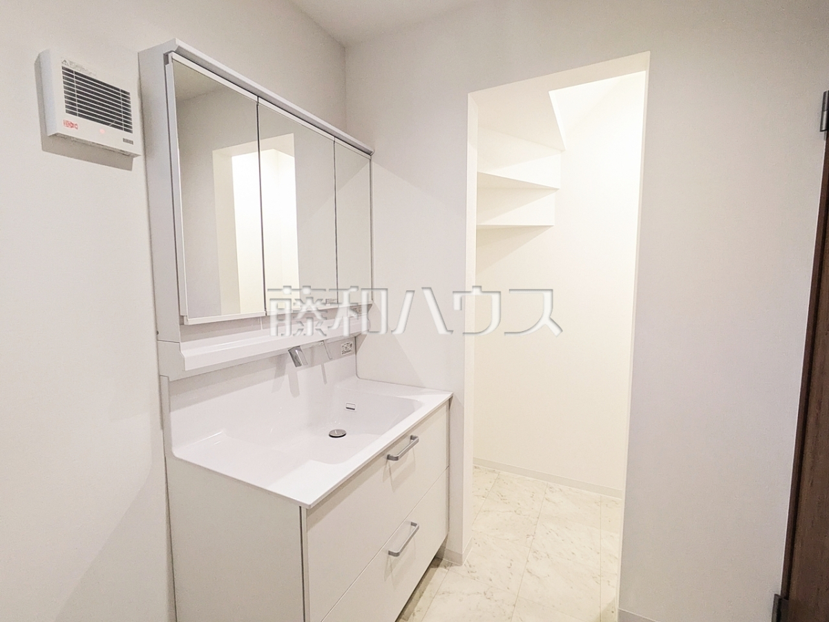 ■三面鏡付きの洗面台。鏡の裏にも収納があり、歯ブラシや化粧品等もすっきり収納できます