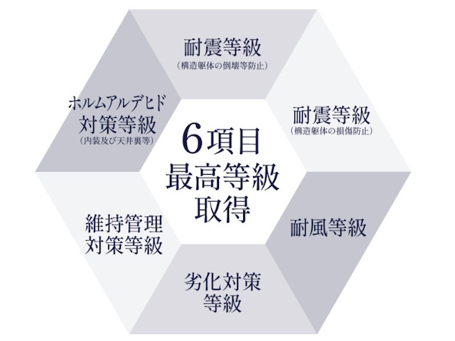 国が定める住宅性能表示制度の中でも防災性や耐久性、環境性能やメンテナンス性など、特に重要な主要6項目に対し、最も高い等級を取得する住宅品質となっています。