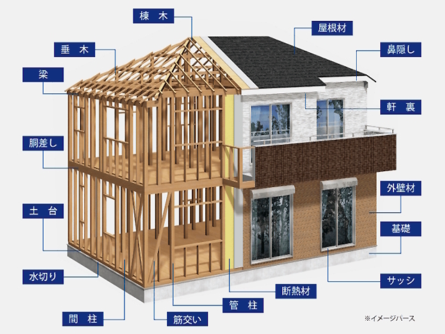 デザイン性と性能の両立を提供するために、木造軸組金物工法(在来工法)を採用しています。「柱」・「梁」・「筋交い」を組み合わせた丈夫なつくりになっているため、耐震性・耐久性も向上させています。