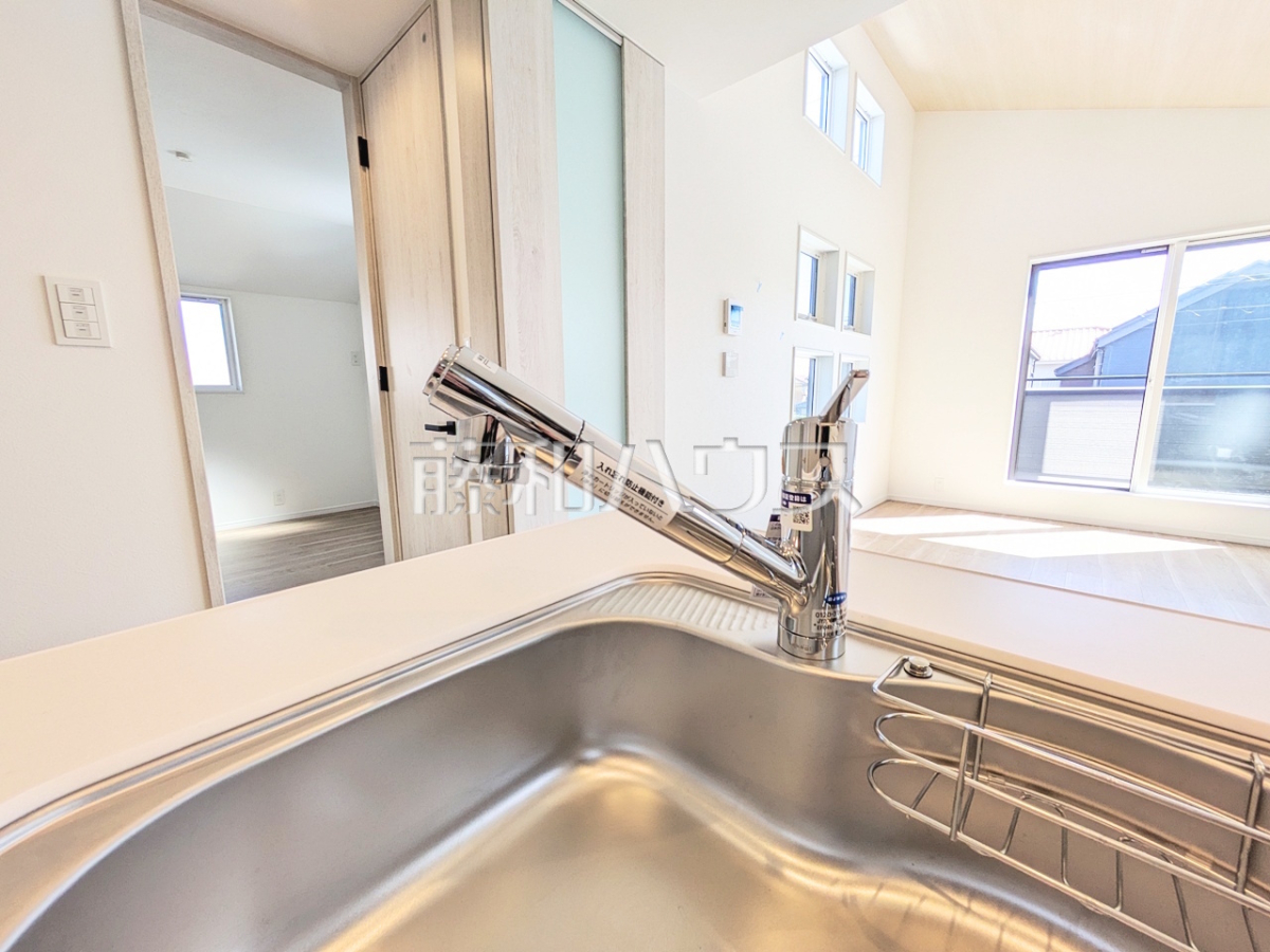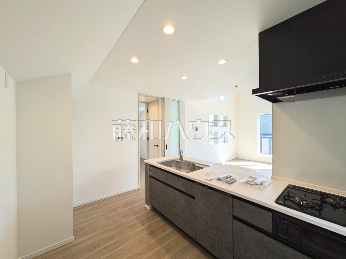 2号棟 キッチン カウンターを設けた対面キッチンからはリビングの様子が見渡せます。家族の会話と笑顔が生まれるホットスポットで、何気ない光景が光に満ちた幸せのひと時となる事でしょう。【日野市大字日野】