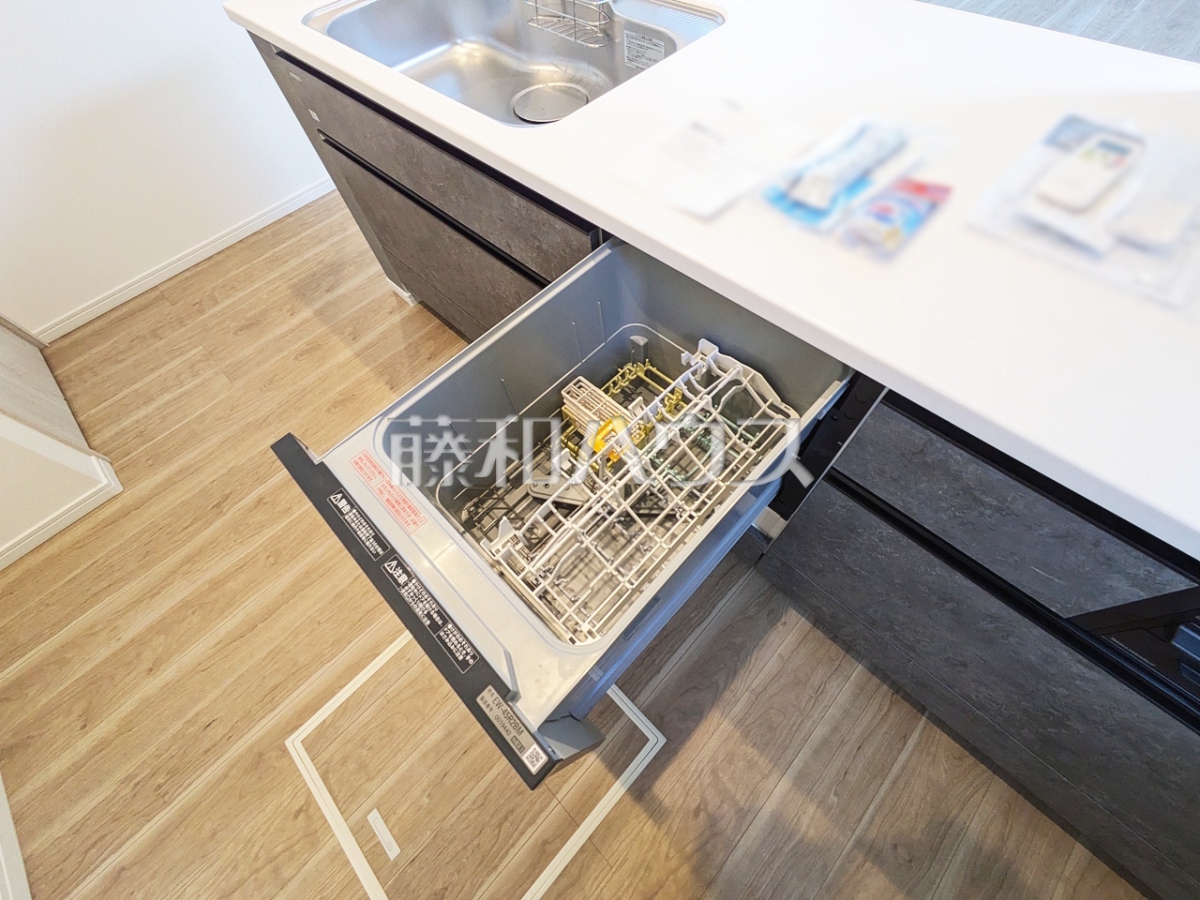 2号棟 キッチン キッチンには、後片付けの手間を削減し、趣味の時間や家族との時間を増やせる食器洗い乾燥機を標準装備。またストック場所として便利な床下収納もございます。【日野市大字日野】