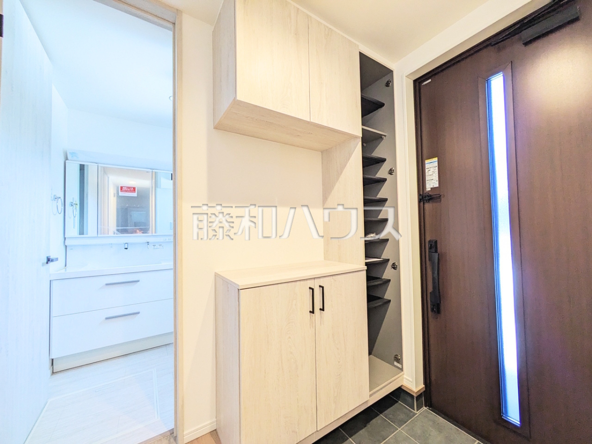 2号棟 玄関 靴だけでなく、お手入れ用品やお子様の遊び用具も収納できる大容量のシューズボックスを設置。すっきりとした空間でお客様をお迎えできます。【日野市大字日野】