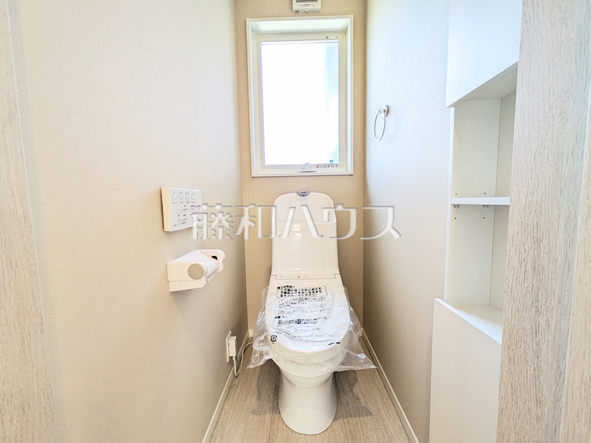 2号棟 トイレ 清潔な空間を保ちたいトイレはオフホワイトでまとめました。毎日使う場所だからこそお手入れも楽々にできる機能が搭載されております。汚れが付着しにくい便器はお掃除も楽々。【日野市大字日野】