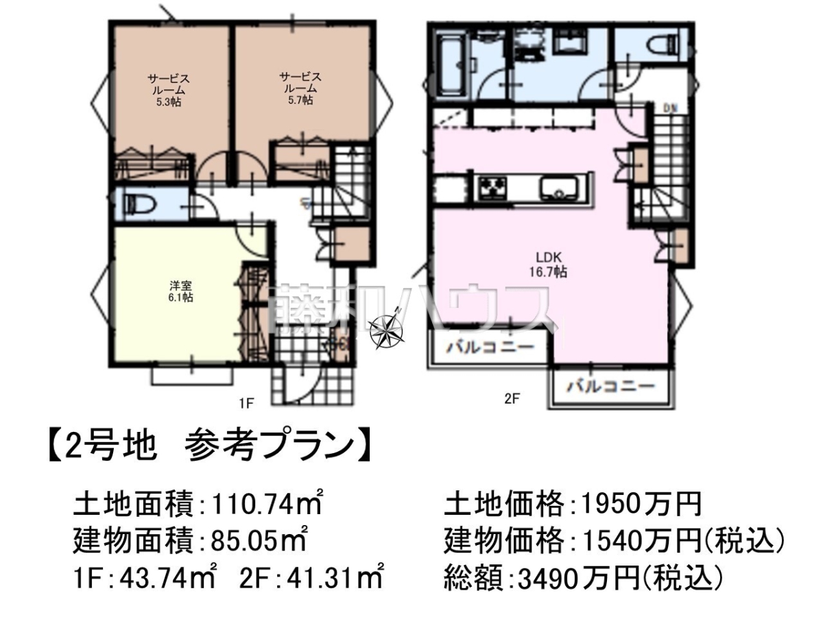 ![2号地 建物プラン例(間取図) 【日野市西平山5丁目】 理想の暮らしを実現する為にはどんな間取りが良いか。希望を叶える為に参考プランをご用意しておりますので、是非お役立て下さい。
