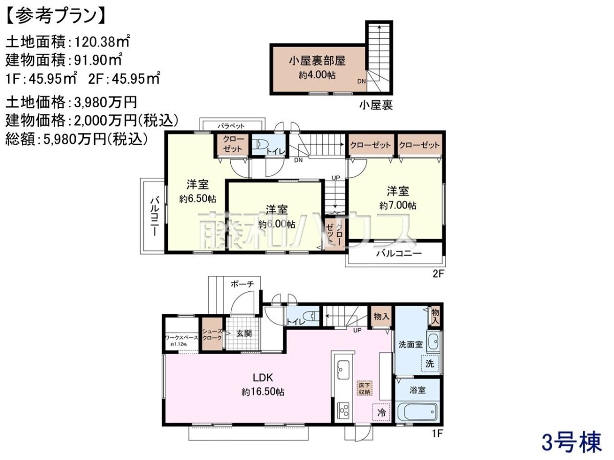 ![3号地 建物プラン例(間取図) 1F:約45.95平米 2F:約45.95平米 建物面積:約91.90平米 建物価格:2000万円(税込) 土地価格:3980万円 総額:5980万円(税込)【国分寺市西町3丁目】