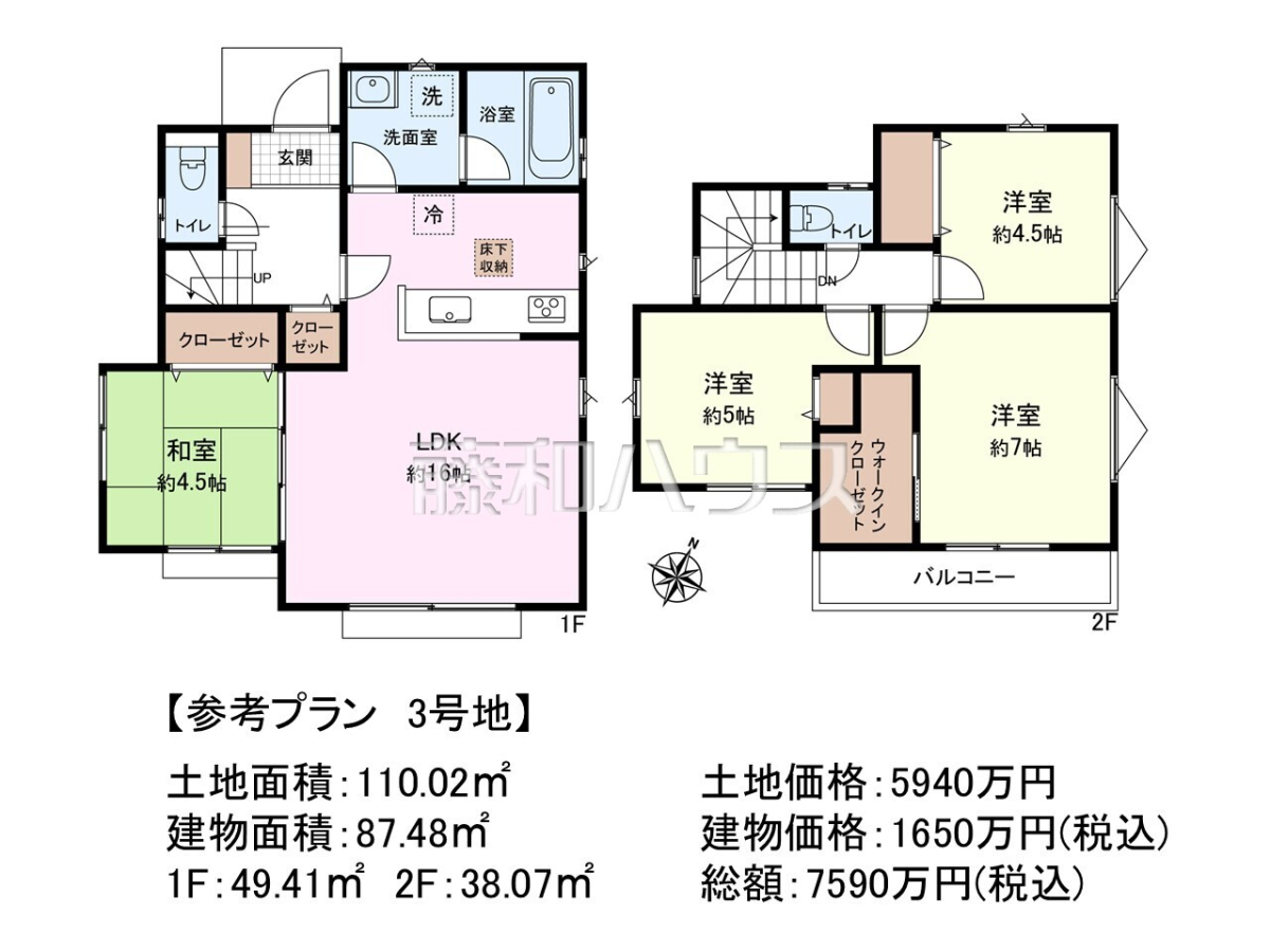 ![2号地 建物プラン例(間取図) 【三鷹市牟礼5丁目】